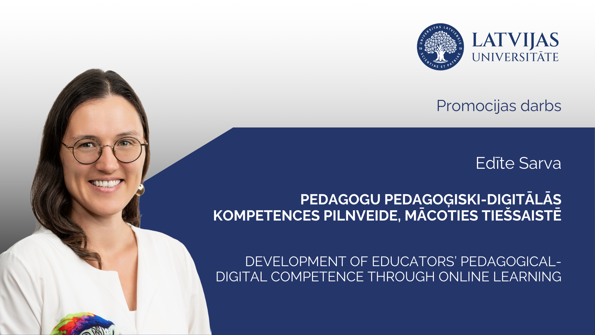 2026. gada 12. februārī plkst. 12.30 Latvijas Universitātes (LU) Promocijas padomes izglītības zinātnēs atklātā sēdē Rīgā, Imantas 7. līnijā 1, 100. auditorijā Edīte Sarva aizstāvēs promocijas darbu “Pedagogu pedagoģiski-digitālās kompetences pilnveide, mācoties tiešsaistē” (Ph. D.) iegūšanai.