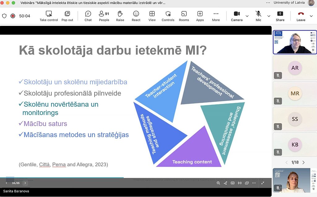 Straujā mākslīgā intelekta (MI) attīstība rada jaunas iespējas izglītībā, tomēr līdz ar tām rodas arī izaicinājumi: kā nodrošināt, ka MI tiek izmantots ētiski, tiesiski un atbildīgi? Uz šo jautājumu atbilde tika meklēta otrajā vebinārā, kas norisinājās 23. oktobrī. To vadīja Latvijas Universitātes asociētā profesore un vadošā pētniece Dr.paed. Sanita Baranova. Vebinārā varēja izzināt par MI ģenerētā satura izmantošanas ētiskajiem un tiesiskajiem apsvērumiem, autortiesību un intelektuālo īpašumu, datu drošības un privātuma nosacījumiem izglītībā, novērtēt MI ietekmi un radītos riskus pedagoga darbā, identificēt ētiskos un tiesiskos aspektus MI lietošanas robežu noteikšanai izglītības vidē.  Tika aplūkoti arī praktiski piemēri un vadlīnijas par MI atbildīgu integrāciju izglītībā, lai ikdienas darbā autonomi un autentiski varētu pieņemt lēmumus, integrējot mākslīgā intelekta (MI) rīkus mācību materiālu izstrādē un vērtēšanas procesā.