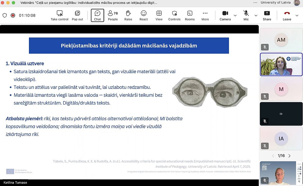 Trešais vebinārs, “Ceļā uz pieejamu izglītību: individualizēts mācību process un iekļaujošu digitālo materiālu izstrāde”, notika 20. novembrī un to vadīja IZPF docētāja un doktorante Ketlīna Tumase. Vebinārs bija veltīts iekļaujošas izglītības principu un digitālo risinājumu nozīmei. Tā laikā tika aplūkots, kā nodrošināt mācību procesu, kas pielāgots dažādu vajadzību skolēniem, un kā digitālie rīki var atbalstīt individuālu mācīšanās tempu, uztveri un informācijas apguvi. Dalībnieki pārrunāja biežāk sastopamās mācīšanās grūtības un analizēja kritērijus, kas palīdz veidot pieejamus digitālos mācību materiālus. Šī diskusija rosināja skolotājus kritiski pārvērtēt savus resursus un meklēt risinājumus, kas ikdienas darbā veicina iekļaujošu un atbalstošu mācību vidi.