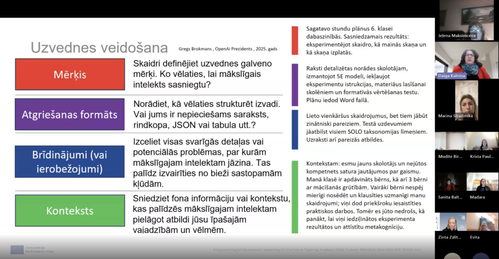 Šī gada vebināru ciklu noslēdza vebinārs “Mākslīgais intelekts pedagoģiskajā praksē: plānošana, diferencēšana un mācību materiālu sagatavošana”, kas norisinājās 4. decembrī. To vadīja docente Dr.paed. Daiga Kalniņa. Tajā pedagogi izzināja MI darbības pamatprincipus, mācījās veidot uzvednes un iepazina dažādus rīkus, kas var palīdzēt gan mācību stundas plānošanā, gan diferencētu materiālu izstrādē. Dalībnieki analizēja praktiskus piemērus, kas parādīja, kā MI var atvieglot mācību materiālu sagatavošanu, ietaupīt skolotāja laiku un vienlaikus piedāvāt skolēniem personalizētāku atbalstu.