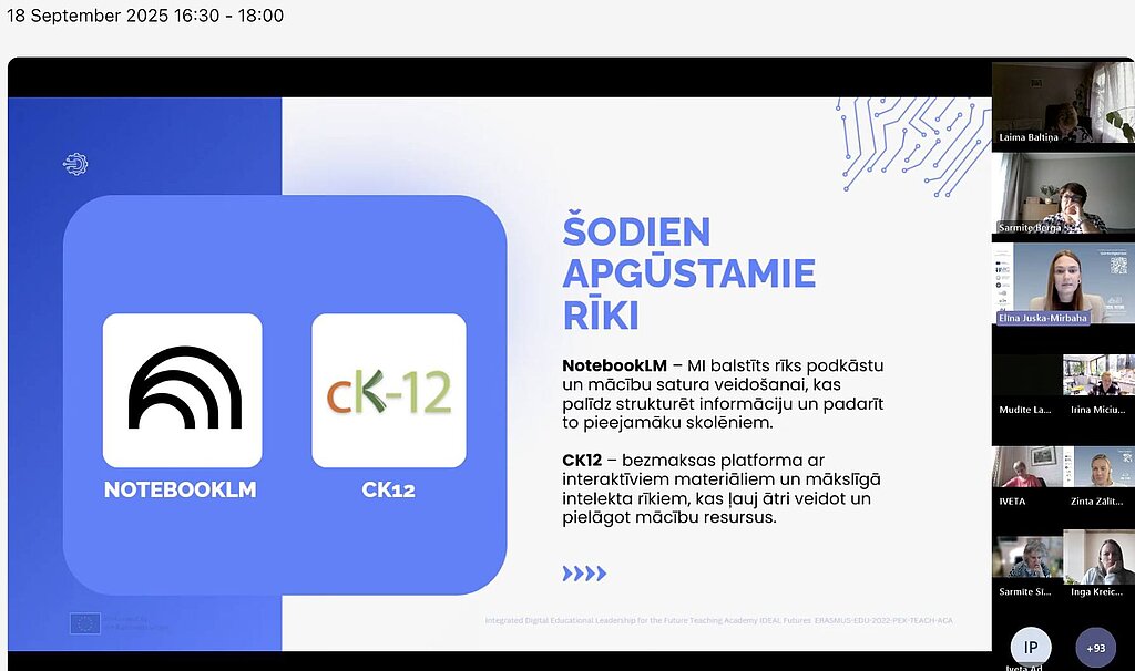 Izglītības zinātņu un psiholoģijas fakultātes komanda piedāvāja iespēju piedalīties četros dažādos vebināros, kas veltīti aktuālām tēmām izglītībā. Pirmais vebinārs “Radošie risinājumi matemātikas mācību procesa pilnveidošanai” notika 18. septembrī, un to vadīja Izglītības zinātņu un psiholoģijas fakultātes docētāja, Mātera Jura Kazdangas pamatskolas datorikas un robotikas skolotāja un LU doktorante Elīna Juska-Mirbaha. eVebināra laikā bija iespēja iepazīties ar diviem inovatīviem digitāliem rīkiem. Pirmajā daļā dalībnieki uzzināja par CK-12 Foundation piedāvāto mākslīgā intelekta rīku, ar kuru iespējams ātri izstrādāt dažāda veida mācību materiālus un viegli pielāgot savas klases vajadzībām. Demonstrācijas laikā varēja paši izmēģināt, kā dažu minūšu laikā sagatavot kvalitatīvu materiālu mācību stundai. Otrajā daļā tika parādīts, kā izmantot Notebook LM rīku, lai skolotāji sagatavotu podkāstus par dažādām matemātikas tēmām. Šādus podkāstus iespējams izmantot mācību procesā kā papildresursus, kas skolēniem palīdz labāk izprast matemātiskos jēdzienus un padara mācīšanos daudzveidīgāku.