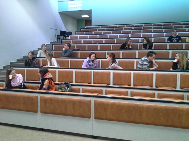 Studentes atjaunojušas krēslus fakultātes galvenajā foajē